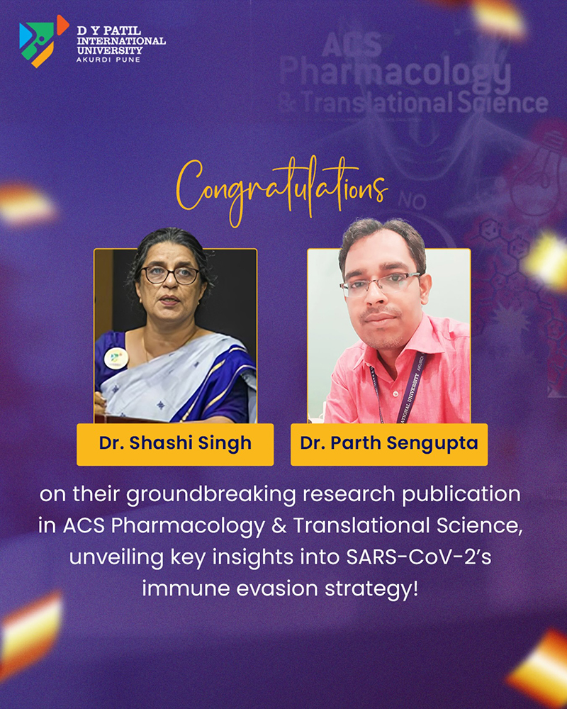 DYPIU congratulates Dr. Shashi Singh and Dr. Parth Sengupta on their impactful research publication in ACS Pharmacology & Translational Science. Their work significantly advances our understanding of SARS-CoV-2’s immune evasion.