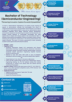 The B.Tech in Semiconductor Engineering stands as the pioneering and trendsetting program in the country. This program is crafted to proficiently respond to the rapidly evolving technology landscape and is strategically designed to nurture employability and entrepreneurship. To instill a sense of empathy, internships in rural, societal, and small industry settings are integrated into the curriculum. The teaching approach follows international standards, emphasizing research-led team teaching.