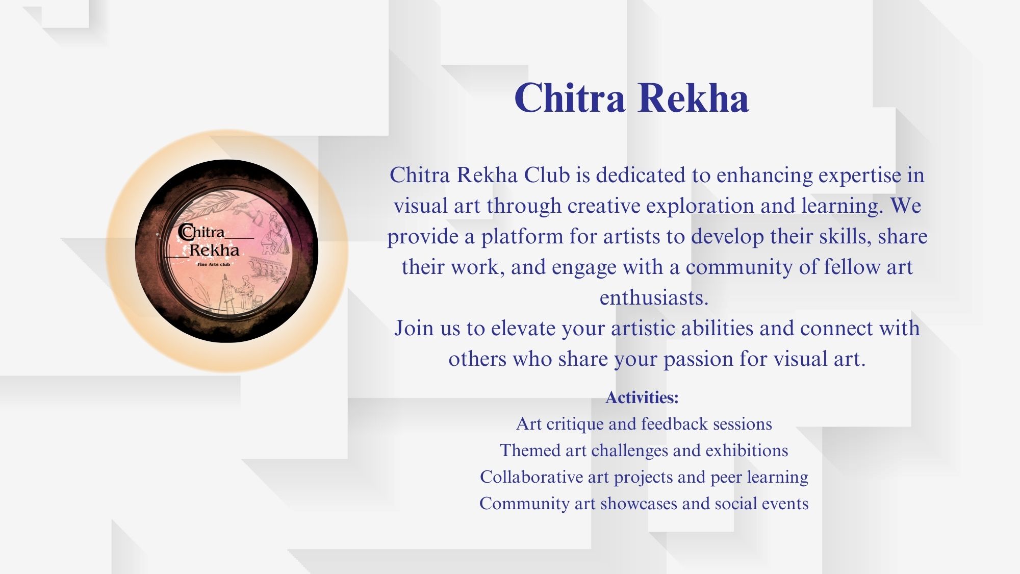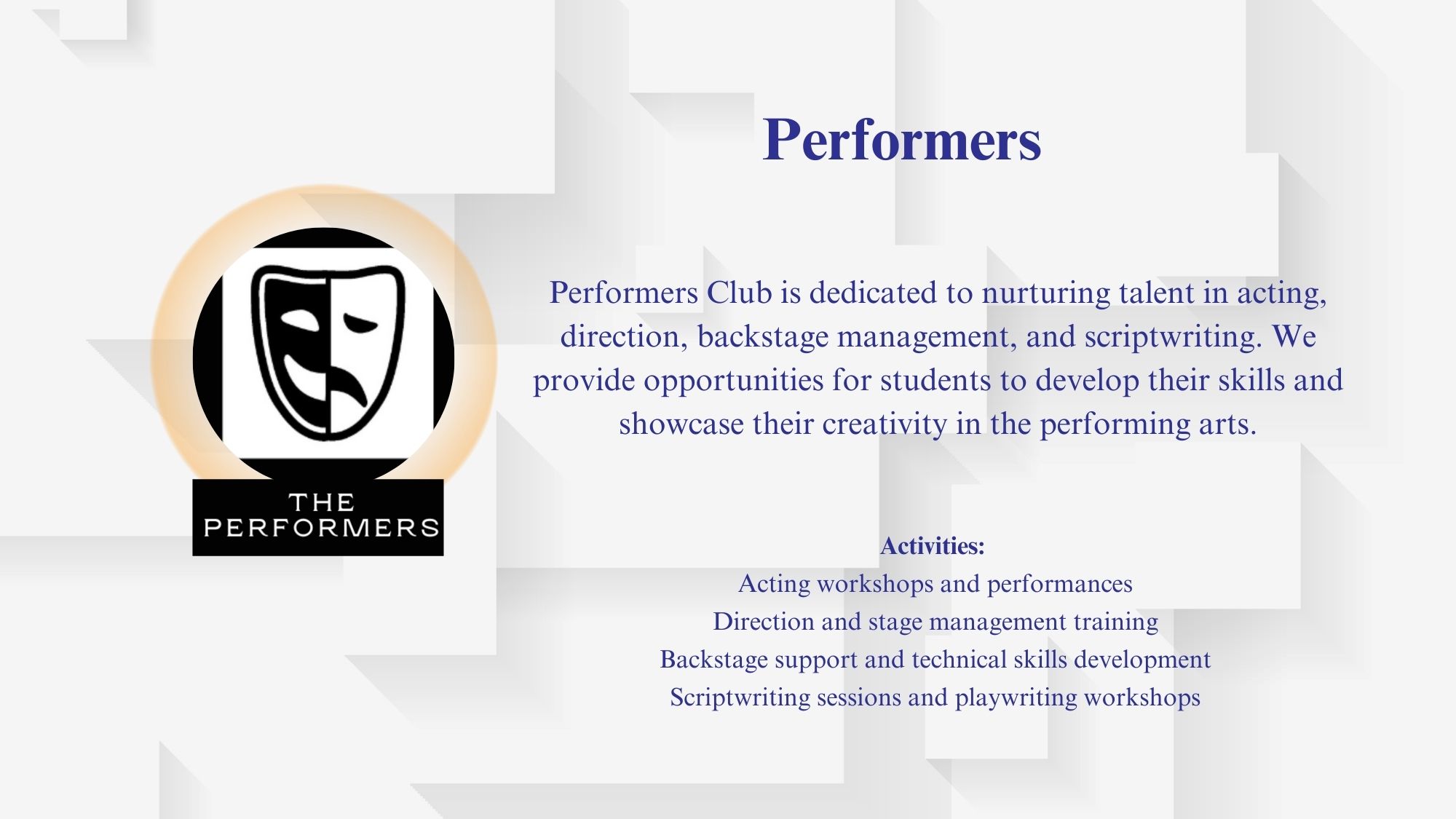 Various Theatre Workshop, Stage plays, Script Writing and Reading, Exploration of diverse art, Develop critical thinking amongst the viewers and performers. Spread Social Awareness, Build a culture of Productivity in a colaborative manner.