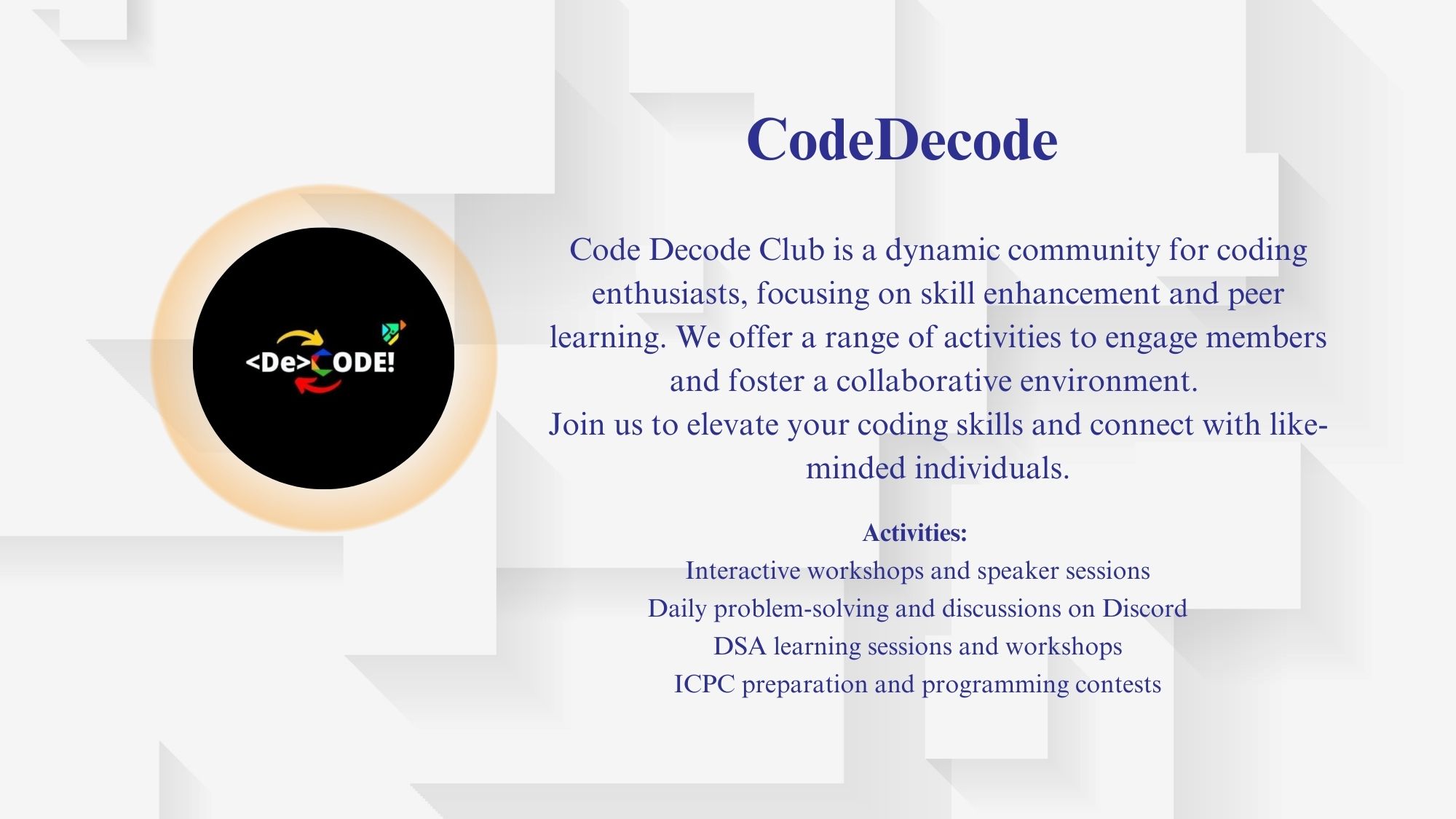 To provide a hands-on approach to the students so they can broaden their vision and knowledge of Programming and promote programming as a sport among students. Our main focus is helping students with competitive programming and DSA.